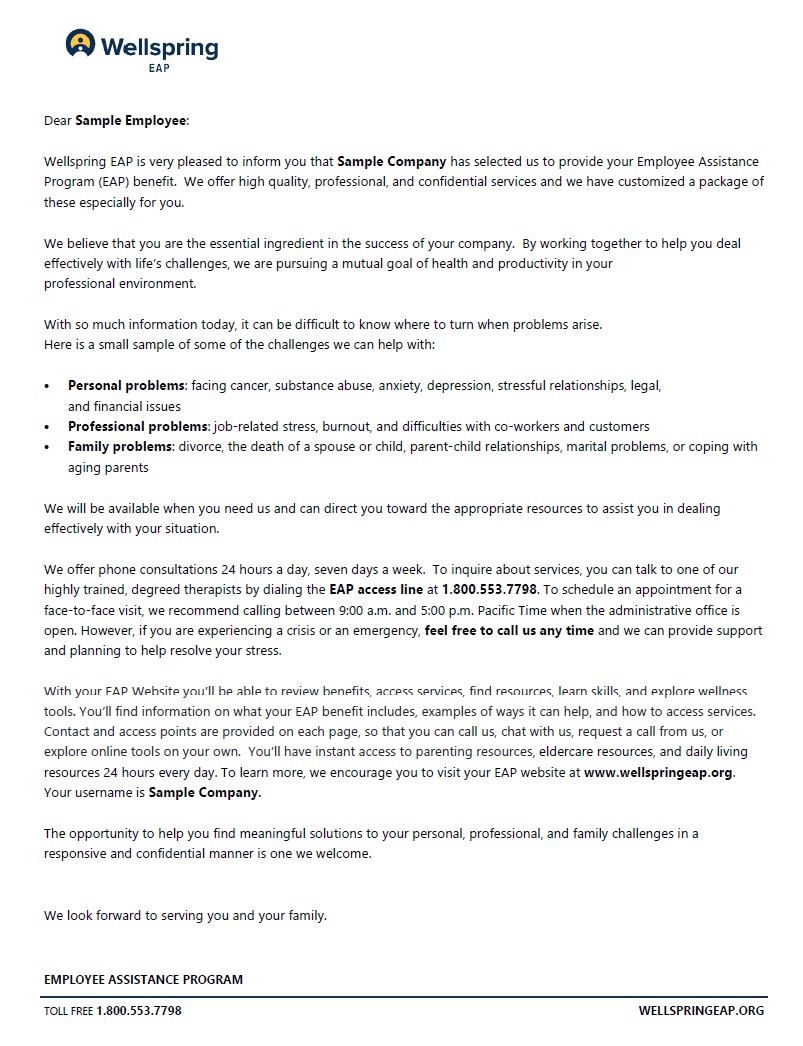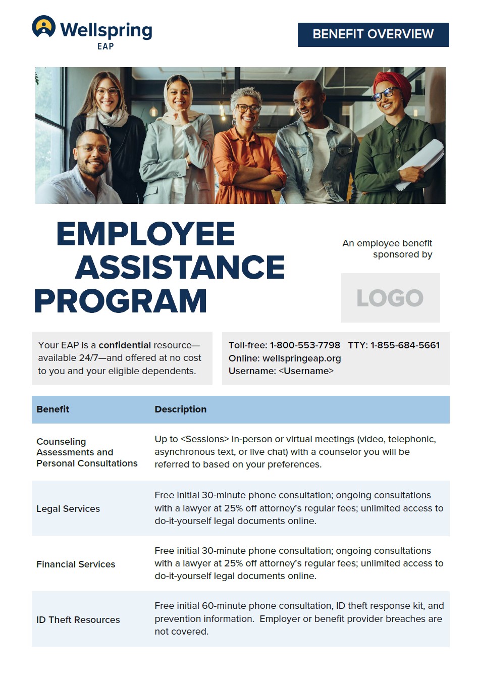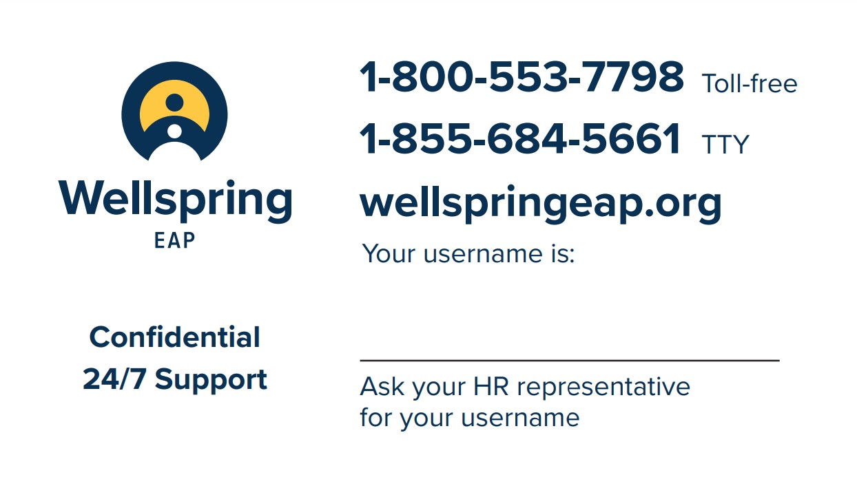 Please allow at least 1 week advance notice for print materials. If you need print materials ASAP, please contact your Wellspring EAP Account Executive directly. We appreciate your patience.